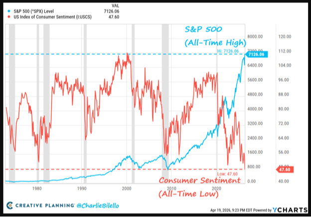 As we watch the Iran conflict get sorted out, and if that happens sooner rather than later with a resolution that opens the Strait of Hormuz and brings energy prices down, the sentiment numbers could bounce back quickly. There have been a number of times when the indicator was at very low levels and subsequent rebounds have been dramatic. So, it’s not unthinkable. We expect this divergence will also eventually turn around. Timing is the question.