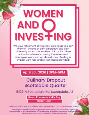 Join us for an engaging and empowering event focused on women and investing. On April 30 from 3PM–5PM at Culinary Dropout in Scottsdale Quarter, guest presenter Kelly Fay of 1920 Funds will share valuable insights to help you build confidence in your financial future. Whether you’re just getting started or looking to refine your strategy, this is a great opportunity to learn, connect, and take control of your financial journey. We hope to see you there!